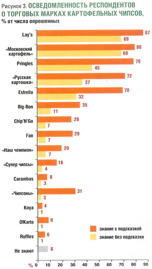 Что касается чипсов, то здесь в первую пятерку по узнаваемости вошли марки Lay’s (Frito Lay, Inc., США), «Московский картофель» (ОАО «Русский продукт», Москва), Pringles (Procter & Gamble, США), «Русская картошка» (ООО «Русскарт», Москва) и Estrella (ООО «Крафт фудс», Москва).