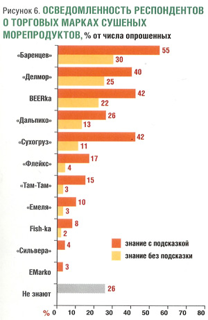 Средняя концентрация торговых марок, узнаваемых покупателями, отмечается в группе соленых морепродуктов. В данной категории покупатели достаточно четко выделяют пять торговых марок: «Баренцев» (ЗАО «Золотой терем», Москва), «Делмор» («Бриджтаун Фудс»), ВЕЕRkа («Сибирский берег»), «Дальпико» (ООО «Дальпико-ДВ», Москва) и «Сухогруз» (ООО «Сухогруз», Москва). Но, несмотря на то, что потребители осведомлены о достаточно большом количестве брендов этого сегмента, велика здесь и доля респондентов, которые не смогли назвать самостоятельно и не узнали в предложенном списке ни одной марки - таких среди опрошенных оказалось 26%.