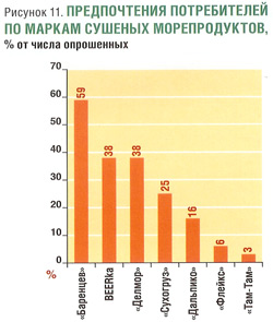 Альтернативой потребления соленых орешков и чипсов к пиву являются сушеные морепродукты. На сегодняшний день лидерами потребления среди торговых марок морепродуктов являются «Баренцев» - ее выбирают 59% воронежцев, ВЕЕRkа и «Делмор» - по 38% голосов потребителей. Устойчивые позиции в потреблении также занимает продукция ТМ «Сухогруз» - пользуется спросом у 25% респондентов и «Дальпико» - 16% опрошенных. А марки «Флейкс» (ООО «Полинекс», Москва) и «Там-Там» (ООО «Там-Там», Москва) покупали в период исследования лишь 6 и 3% респондентов соответственно.