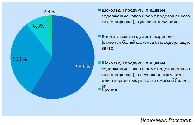 В структуре производства кондитерских изделий можно выделить несколько подгрупп, самой многочисленной их которых является шоколад и изделия, содержащие какао, в упакованном виде. Данная подгруппа включает в себя такие изделия, как шоколадные плитки и батончики с начинкой, добавками и без них, шоколадные конфеты с алкоголем, прочие шоколадные конфеты, различные шоколадные фигуры с начинкой, пасты на основе какао и другие изделия. По оценочным данным, доля данной группы в 2014 г. составляла 58,6% в натуральном выражении, что эквивалентно 1013 тыс. т готовой продукции.