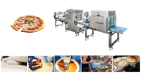 - Лента с метками для размещения шариков из теста - Насыпки для муки - Конвейерная лента для предварительного ламинирования - Вращающиеся прижимные головки - Дозатор и распределитель томата - Станций посыпки сыром - Загрузочная сетчатая лента на туннельную печь