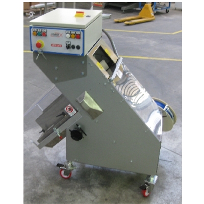 Автоматическая хлеборезка с металлическим корпусом на роликах. Скорость конвейеров регулируется. Верхний конвейер регулируется по высоте. Лоток выхода продукта и выталкиватель последней буханки, батона хлеба.