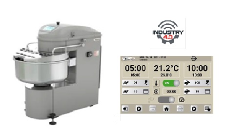 • Электронный пульт управления с 50 программами • Стальная несущая конструкция, дежа из нержавеющей стали • Спираль и колонка из сверхпрочной нержавеющей стали • Двухскоростной двигатель привода спирали с управлением по таймеру • Реверсивный двигатель привода дежи • Регулируемые ременные передачи • Колеса для перемещения с системой блокировки • Непосредственный привод спирали СЕНСОРНЫЙ ЭКРАН 7” Установленные и текущие значения всегда видны Интуитивное Программирование Состояние машины и сигналы тревоги всегда видны Визуализация температуры теста Значение скорости спирали Установленное значение скорости ванны* ( с инвертером ) Максимальная температура безопасности Остановка, если температура достигает максимума Автоматический работая режим