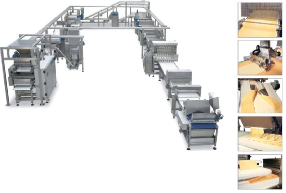 Тесто, замешанное в смесителе, подается в экструдер-делитель, а после этого в ламинатор, который выдает на ленту транспортера уже сформированный пласт теста нужной толщины и ширины. Затем на тесто наносится слой жира, и оно попадает в мультироллерную машину, где материал прикатывается и формируется. После деликатного надавливания роликами на поверхность, тесто попадает на качающийся конвейер, послойно укладывающий его на транспортер, далее калибратор доводит толщину теста до требуемой величины. Количество прикатных и укладочных устройств зависит от количества необходимых слоев слоеного теста