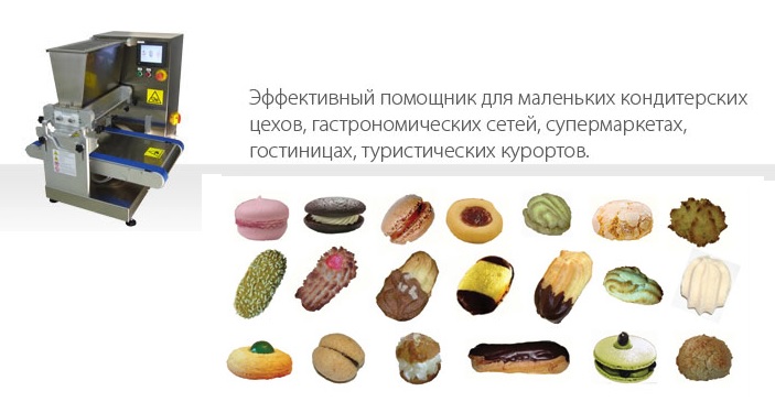 Очень маленькие габариты машины: всего 80х70 см, является незаменимым помощником в маленьких кондитерских цехах. Эклеры, теста содержащие толченый миндаль, песочные теста, макарун, бисквит, кексы, муссы, дозировка в формовые листы и многое другое.