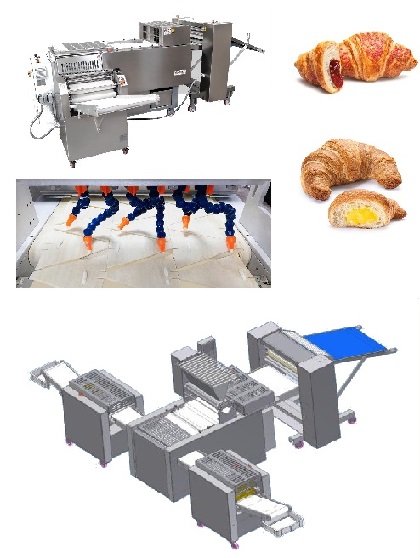 Производство круассанов с начинкой до 4 000 шт / час. Электронное управление скорости резки , позволяет регулировке очень быстро и эффективно при каждом изменении формата круассана. Пласт теста вокруг скалки помещается на входной конвейер. Подача контролируется автоматически, и производство продолжить, так как различные пласта тста на скалках автоматически помещаются и затем соединяются вместе с проходом калибраторных цилиндров. Чтобы тесто не прилипало к вращающемуся лезвию, треугольники разрезать на два этапа. Начинка дозируется на тесто с помощью шестеренчатого насоса. Затем треугольники автоматически переносятся на единицы измерения свертывание. Продукт аккуратно свернут, как если бы операция была выполнена ручной. Не нужно пудрить мукой, таким образом получается превосходное качество. Благодаря боковым скребкам вырезы собираются в емкость для быть встроены в следующий обзор