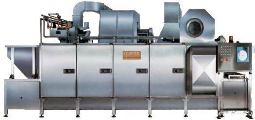 Прохождение продукта выполняется на форированной стальной ленте (нержавеющая сталь) для лучшего прохождения воздуха. Печь состоит из 3-х частей для различных этапов производства: подсушка, жарка, охлаждение. В первой зоне выполняется подсушивание при средней контролируемой температуре, во второй зоне происходит обжарка с прохождением потока горячего воздуха сверху вниз. Эти две зоны напрямую связаны одна с другой и воздух, используемый в первой зоне, проходит в зону жарки, и возвращается в зону подсушивания, обеспечивая значительную экономию тепловой энергии. Обе фазы управляются электронной системой контроля с программируемым микропроцессором PLC Siemens серия S7. Оператор управляет рабочими программами на внешней панели управления. Третья зона используется для охлаждения продукта. Она никак не связана с двумя первыми, и в этом случае электронная аппаратура показывает только возможные неполадки в работе данной зоны. Печь имеет пульт управления, на котором можно быстро установить рабочие параметры, с системой записи и печати данных. После жарки и охлаждения продукт выходит из печи.