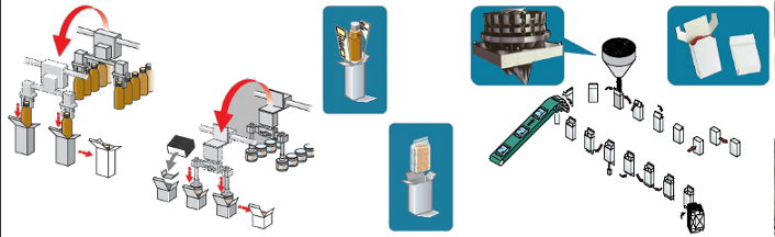 Картон (предварительно сложенный, плоские заготовки) подвергается операциям: формовка коробки, склеивание дна коробки, подача на узел наполнения к весовому дозатору или на узел укладки пакетов в коробку. Далее, коробка с продуктом закрывается, заклеивается верхний клапан, далее коробка попадает на отводной транспортер готового продукта.
