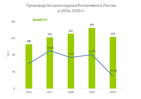 По данным «Анализа рынка шоколадных батончиков в России», подготовленного BusinesStat в 2021 г, за 2016-2019 гг их производство в стране выросло на 39 тыс т: с 106 до 145 тыс т.
