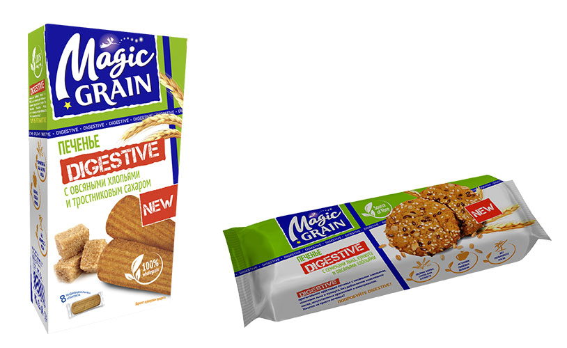 Новинки Magic Grain не ограничиваются хлебцами – новые печенья Digestive особенно понравятся активным людям - именно это печенье в своем составе имеет повышенное содержание пищевых волокон, что обеспечивает заряд и бодрости на долгое время после употребления. Печенье Digestive с семенами льна, кунжута и овсяными хлопьями имеет очень богатый внешний вид благодаря обсыпке, а вариант с овсяными хлопьями и тростниковым сахаром внутри своей упаковки содержит 8 брикетов в индивидуальной упаковке, их можно взять с собой на работу, в школу, в путешествие.