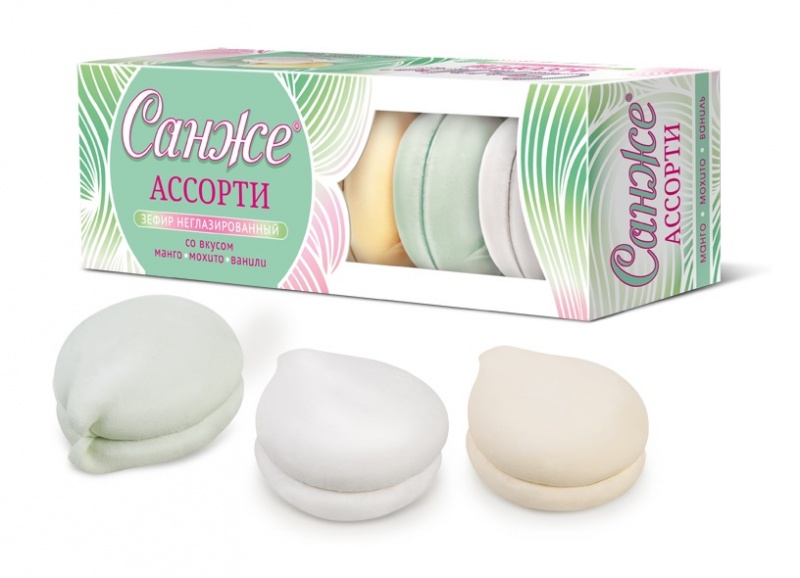 Еще одна новинка Пензенской кондитерской фабрики – зефир «Санже» Ассорти» в новой подарочной упаковке. Изготовленный из натуральных компонентов: яблочного пюре и пектина, оригинальный зефир выпускается в форме популярного французского десерта – макарун. Изысканный десерт станет оригинальным презентом и легким лакомством. В каждой упаковке ассорти из зефира с оригинальными вкусами ванили, манго и мохито. Новый «Санже» Ассорти» продается и в весовом формате.