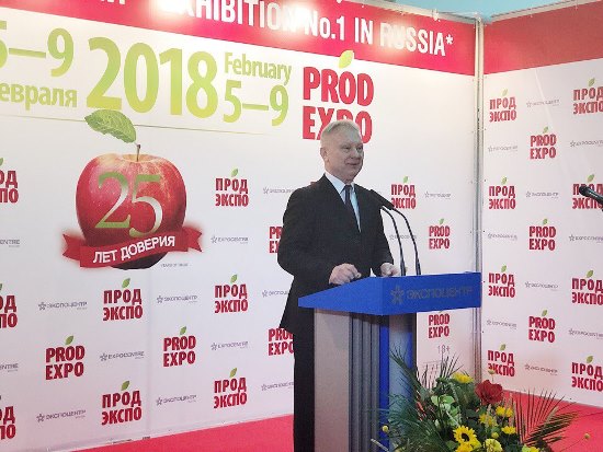 На официальной церемонии открытия заместитель генерального директора АО «Экспоцентр» Михаил Толкачев выразил признательность компаниям, поддержавшим идею проведения первой выставки «Продэкспо» в 1994 году. «Количество российских участников тогда едва превышало 1/6 всех экспонентов, – сообщил Михаил Толкачев. – В последние годы отечественные компании доминируют на выставке, составляя 2/3 всех участников».В юбилейной 25-й международной выставке «Продэкспо-2018» участвует 2342 компании из 63 стран мира. Российских компаний насчитывается 1659. Отмечается рост региональных коллективных экспозиций. В этом году 14 регионов России представлены на выставке коллективными стендами. Михаил Толкачев поблагодарил за участие в выставке зарубежные компании, которые, по его словам, «видят потребительскую ценность выставки «Продэкспо» и выбирают её местом выхода на российский рынок». На государственном уровне в «Продэкспо-2018» участвует 31 страна. Крупнейшую национальную экспозицию, объединившую 45 компаний, представляет Италия. В этом году с национальными экспозициями дебютируют Азербайджан, Грузия, Доминиканская Республика и Непал. Обращаясь к участникам юбилейной выставки, заместитель министра сельского хозяйства Российской Федерации Евгений Громыко зачитал приветственный адрес министра сельского хозяйства России Александра Ткачева. В приветствии говорится, что «выставка «Продэкспо» за четверть века стала крупнейшей выставкой в России. С каждым годом поднимается статус выставки, участники демонстрируют лучшие образцы продукции, новейшие достижения и технологии. Разнообразна и насыщенна программа деловых мероприятий, определяющая главные ориентиры развития продовольственного рынка». У выставки «Продэкспо» большое будущее, уверен председатель Комитета Совета Федерации по аграрно-продовольственной политике и природопользованию Михаил Щетинин. По его мнению, широкое международное представительство на «Продэкспо-2018» говорит о растущем интересе зарубежных партнеров к продовольственному рынку России, а значительное число отечественных участников – об успехе политики импортозамещения. Председатель Комитета Государственной Думы по аграрным вопросам Владимир Кашин отметил достижения российской сельскохозяйственной отрасли и приоритетные направления его развития. Он поблагодарил организаторов смотра «Продэкспо» и призвал региональные структуры активнее использовать возможности этой «базовой, одной из самых крупных в Европе выставок». «Проведение выставки – это необходимый и важный шаг на пути развития отечественной пищевой промышленности, – приветствовал участников выставки председатель Комитета Государственной Думы по региональной политике и проблемам Севера и Дальнего Востока Николай Харитонов. – Выставка будет содействовать поиску новых и перспективных подходов ускоренного развития и повышения продуктивности всех отраслей пищевой промышленности, сотрудничеству производителей сельхозпродукции, перерабатывающих и посреднических организаций». С 25-летним юбилеем выставку «Продэкспо» поздравил министр сельского хозяйства Венгрии Шандор Фазекаш. «Выставка предоставляет замечательный шанс для венгерских производителей представить свою продукцию», – сказал министр. От имени Торгово-промышленной па