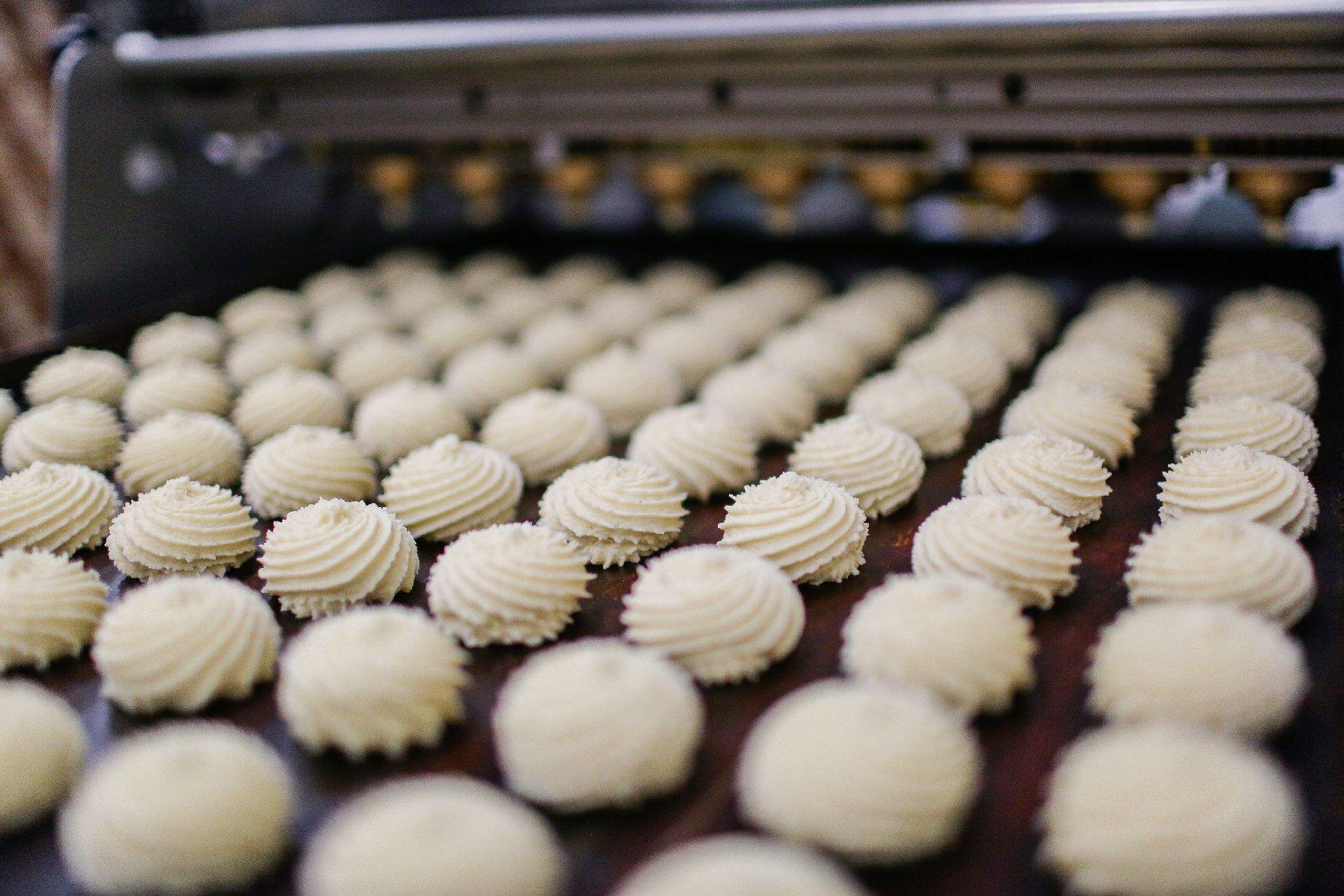Процесс готовки печенья несколько отличается. После тестомеса и тестоделителя кусочки теста помещают в кондитерскую отсадочную машину, которая придает им нужные формы — звездочки, цветочки и так далее. Затем, если необходимо, пекари добавляют в формы джем. Печенье, в отличие от хлебобулочных изделий, в расстойке не нуждается. Его сразу отправляют в печку.
